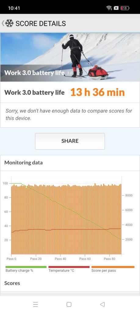 Oppo Reno10 Pro 5G dilengkapi dengan baterai 4.600 mAh, yang menawarkan daya baterai yang layak untuk pengguna ringan. Saya rata-rata mendapatkan sekitar 7 jam waktu aktif layar di antara pengisian daya, dengan penjelajahan biasa, bermain game, WhatsApp, dan beberapa navigasi. Pada tes baterai PCMark 3.0, OPPO Reno10 Pro 5G kembali dengan skor 13 jam dan 36 menit, hasil yang bagus tapi tidak hebat.