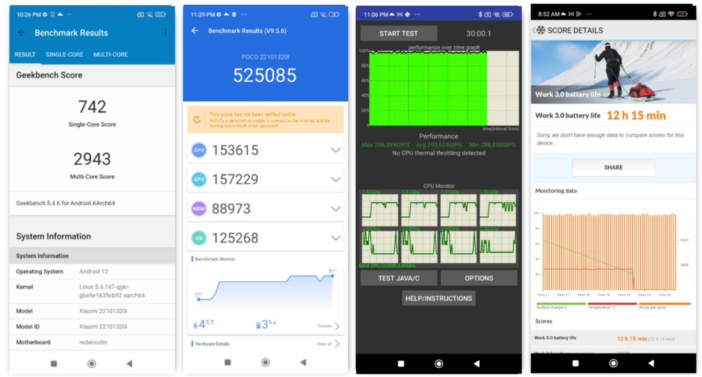 Secara sintetis, smartphone ini berkinerja lebih baik daripada beberapa ponsel bertenaga MediaTek Dimensity 1080 SoC dalam kisaran harga yang sama. Perangkat ini menghasilkan 525.085 poin di AnTuTu, sementara skor multi-core Geekbench 5-nya adalah 2.943 poin. Selain itu, tidak ada penurunan performa saat menjalankan 50 thread selama setengah jam pada tes CPU Throttle. Meski terdengar mengesankan, saya melihat ada sedikit pemanasan pada ponsel meski ada 12-layered graphite cooling. Tetapi Anda harus memahami bahwa perangkat ini telah bekerja maksimal hingga batasnya, dan beberapa masalah kenaikan suhu tidak dapat dihindari.