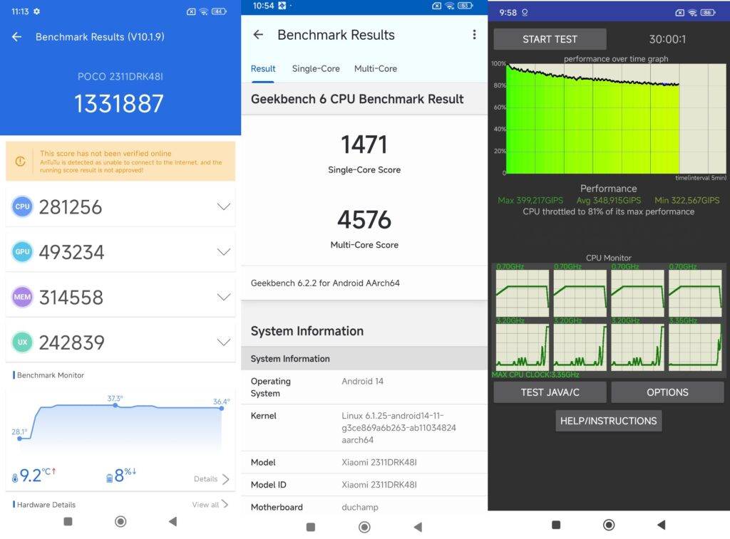 Untuk skor benchmark, skor ponsel Poco ini cukup dekat dengan SoC kelas atas Snapdragon 8 Gen 2. Di AnTuTu, smartphone ini menghasilkan skor 1.331.887, sedangkan di Geekbench, smartphone ini meraih skor 1.355 dan 4.315 untuk pengujian single-core dan multi-core. Uji throttle CPU terlihat sama baiknya, dengan smartphone yang melakukan 81 persen dari output puncaknya. Perangkat ini tidak terasa panas bahkan ketika menjalankan tugas berat, berkat adanya vapour chamber yang efektif. Tapi saya merasa faktor suhu sekitar ikut mempengaruhi juga.