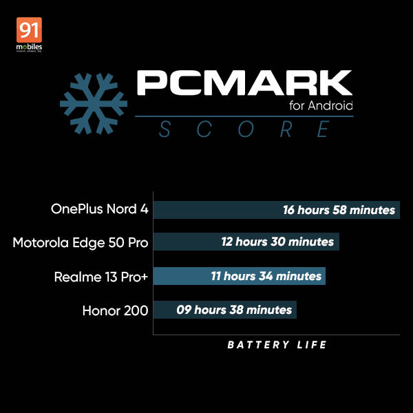 Perangkat ini tampaknya mampu bertahan seharian dengan sekali pengisian daya dengan penggunaan sedang hingga berat. Skor PCMark yang diraihnya adalah 11 jam 34 menit, turun dari 100 persen menjadi 20 persen daya tahan baterai. Dalam pengujian streaming video YouTube kami, ponsel menghabiskan 5 persen baterainya setelah 30 menit pada kecerahan layar dan volume 50 persen. Selama bermain game, Realme 13 Pro Plus menghabiskan sekitar 22 persen baterainya setelah memainkan BGMI, Call of Duty, dan Real Racing 3 masing-masing selama 30 menit.