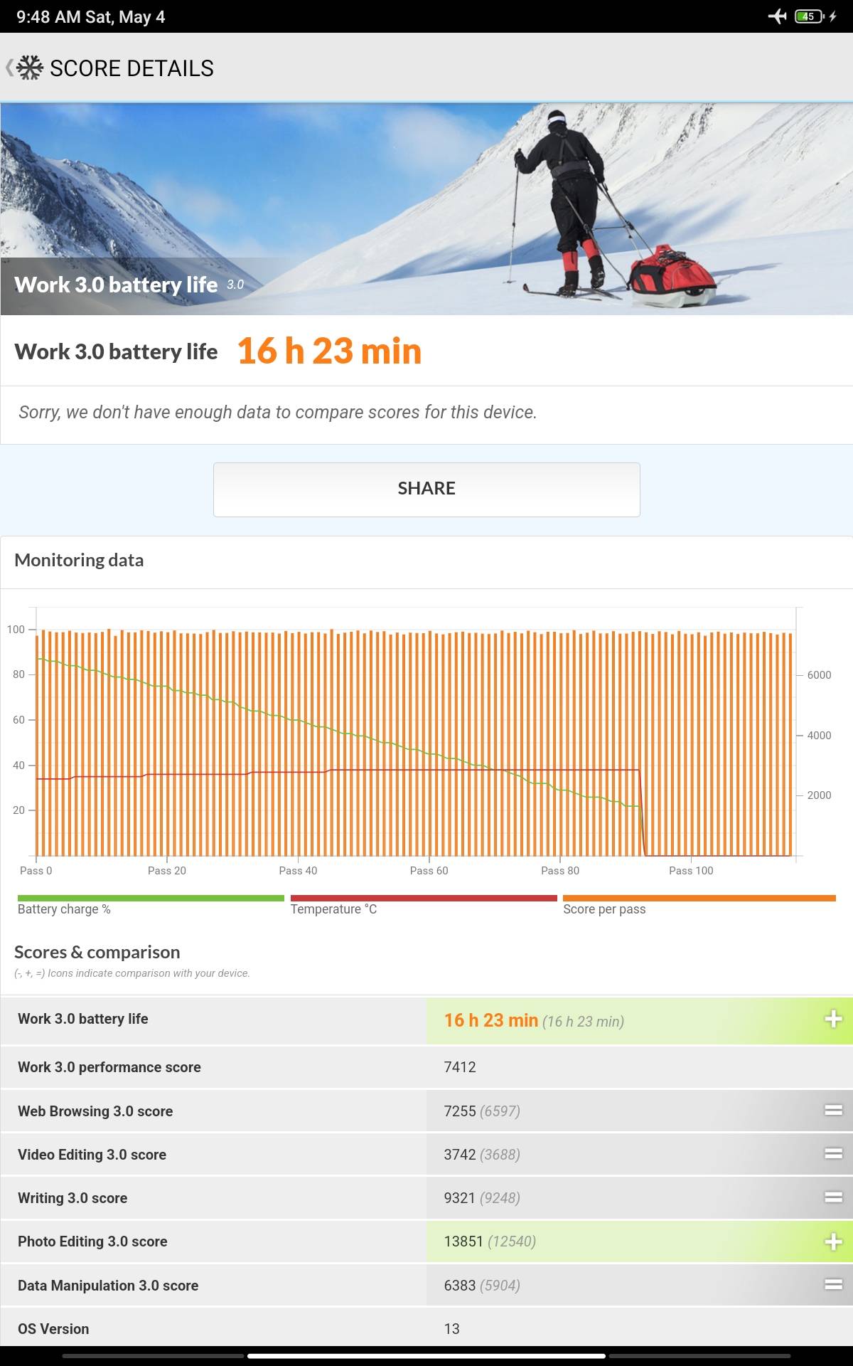 Pengisian daya penuh mencapai 16 jam 23 menit yang mengesankan pada tes baterai PC Mark, dengan 20 persen baterai masih tersisa di dalam tablet. Pada pengujian pemutaran YouTube selama 30 menit, daya tahan baterai tablet ini hanya berkurang 3 persen dengan tingkat kecerahan dan volume 50 persen. Hal ini menunjukkan bahwa Redmi Pad SE seharusnya dapat memberikan Anda sekitar 9-10 jam waktu aktif layar dengan pemutaran video. Mengingat ini adalah tablet murah, daya tahan baterai tampaknya cukup memadai.