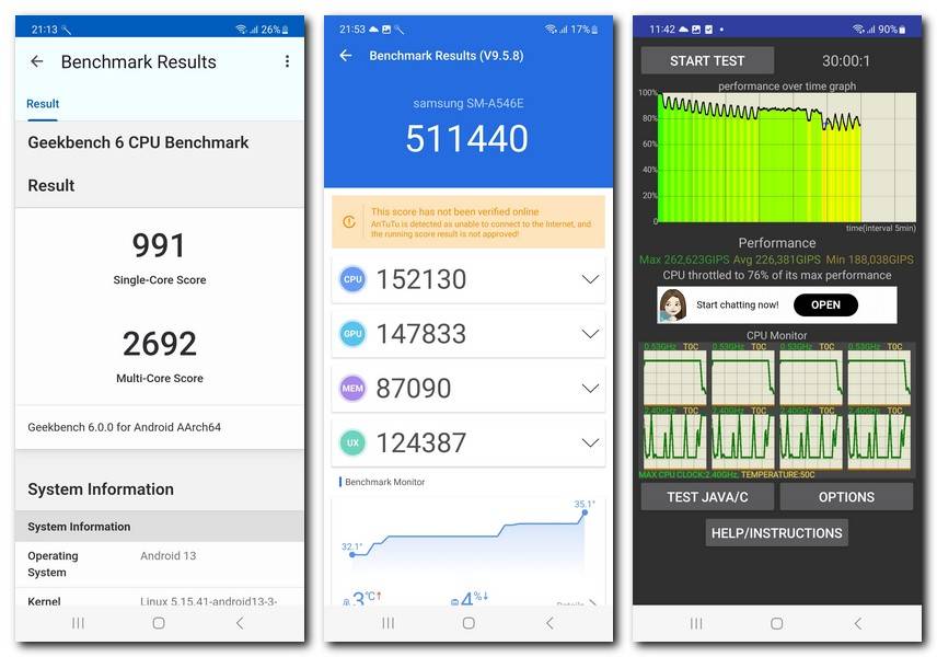 - Bagaimanapun, konsumen yang tidak memerlukan performa tinggi untuk melakukan tugas sehari-hari tidak akan kecewa dengan A54. Saya dapat mengoperasikan berbagai aplikasi media sosial, Chrome, layanan streaming music dan platform OTT tanpa hambatan. Ada dukungan RAM 8GB LPDDR4X dan penyimpanan UFS 2.1 256GB. Keduanya cukup memadai. Anda juga dapat menggunakan slot microSD 1TB untuk memperluas kebutuhan penyimpanan Anda. Adapun tugas-tugas intensif yang berkaitan dengan grafis seperti bermain game, ponsel akan nyaman digunakan jika Anda membatasi pengaturan ke sedang dan menjaga jumlah frame rate pada 45fps. Tidak ada muncul panas yang perlu dilaporkan tetapi jika Anda memang ingin bermain game di ponsel, ada beberapa pilihan lain di pasar yang lebih sesuai untuk dipilih.