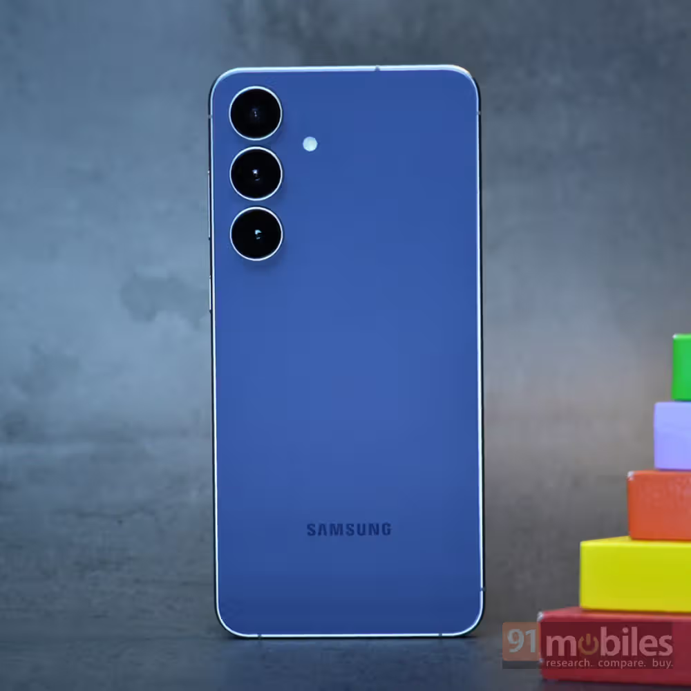 Secara desain, tampilannya masih sangat mirip dengan Galaxy S24 FE. Panel belakang menggunakan kaca matte yang terasa halus dan tidak mudah dihinggapi noda sidik jari. Unit yang diuji tim 91Mobiles merupakan varian warna Navy Blue, tampil elegan sekaligus premium. Bingkai aluminium barunya memberikan kesan kokoh dan menambah kenyamanan grip, walau sayangnya panel belakang terasa cukup licin jika tidak memakai casing.