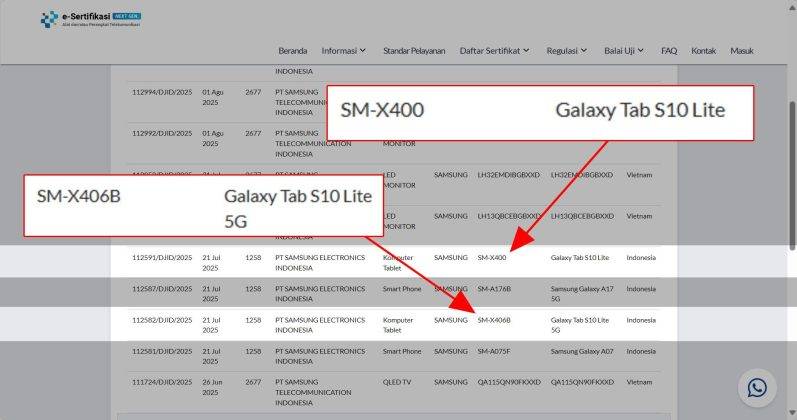 • Nomor sertifikat 112591/DJID/2025 untuk perangkat SM-X400 (Galaxy Tab S10 Lite varian Wi-Fi only).