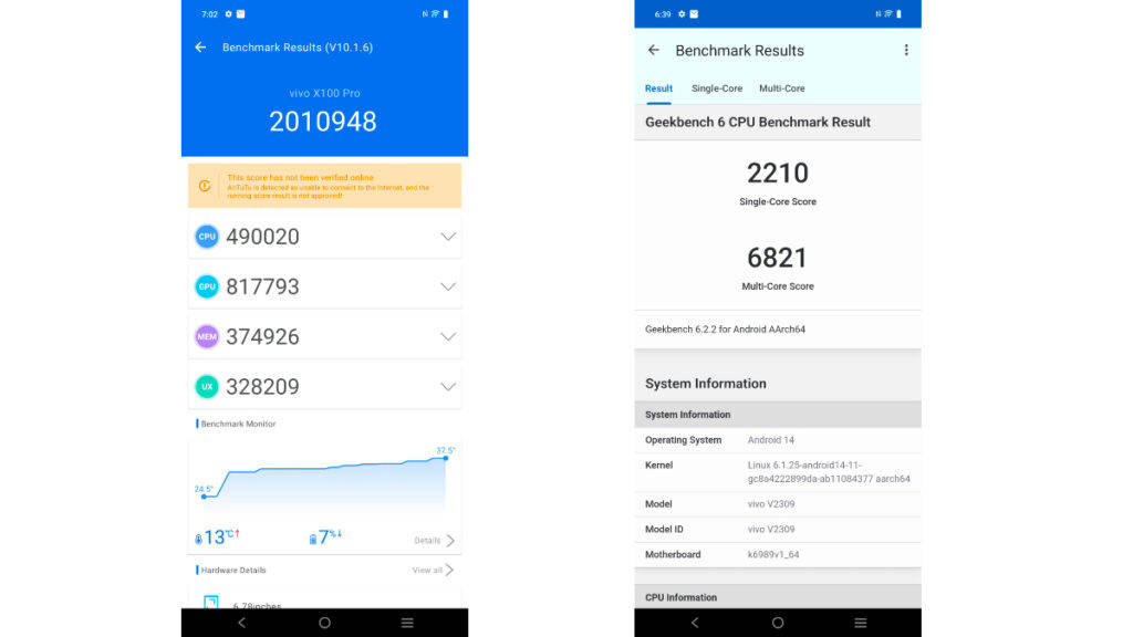 Vivo X100 Pro merupakan ponsel pertama di india yang mendapatkan chipset Mediatek 9300 terbaru. Ini merupakan chipset andalan dari Mediatek yang berjalan pada semua core atau inti besar: 4 core Cortex – X4 untuk performa dengan kecepatan 3.25Ghz dan 4 core Cortex A720 untuk efisiensi dengan kecepatan 2.0Ghz. Di AnTuTu, Chipset ini mencetak skor 2.010.948. Di Geekbench mendapat skor 2210 dan 6821 untuk single-core dan multi-core. Skor ini memberi tahu kita bahwa chipset ini mampu bersaing dengan Snapdragon 8 Gen 3, yang mendapat skor 2.073.660 di AnTuTu dan skor 2223 serta 6799 di Geekbench dalam iQOO 12. Sejauh tes benchmark berjalan, Snapdragon 8 Gen 3 menang secara keseluruhan, tetapi Dimensity 7300 lebih baik dalam beberapa aspek.