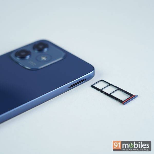 The Lava Shark 5G appears to have drawn design inspiration from its rival, the itel A80 (review). The handset features a squircle camera module on the back, housing two vertically aligned camera rings that protrude slightly. Compared to the itel smartphone, the module is noticeably smaller and sports a standard LED flash instead of a ring flash. However, it is worth noting that the LED flash on the Shark 5G is placed within a subtle glittery ring, which might irk some users due to its off-centre alignment.