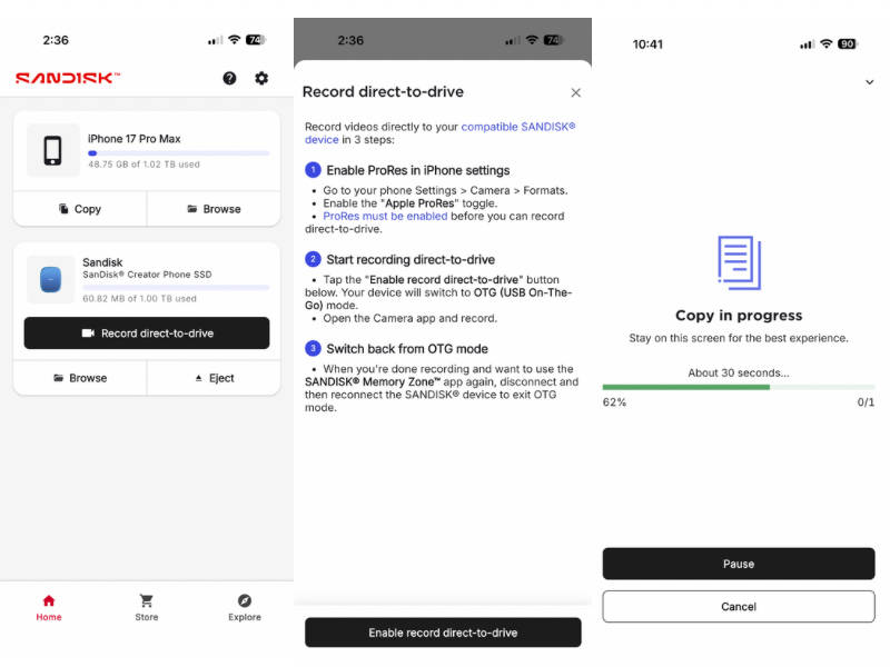 The Creator Phone SSD works plug and play, and the Sandisk Memory Zone app (available for both Android and iOS) provides a barebones but functional interface to your stored files. While you can use the SSD as external storage for smartphones and laptops, one of its most noteworthy capabilities is that it enables direct-to-drive ProRes video recording. For the uninitiated, this is Apple’s video codec that uses less compression to retain more detail, and also gives you better, more flexible editing capabilities, in an attempt to produce pro-grade video footage preferred by filmmakers and enthusiasts. Footage shot in ProRes takes up a lot of storage, so the Sandisk Creator Phone SSD works well for this purpose. Once the ProRes option is enabled in camera settings, you can put the SSD in OTG mode via the companion app and then proceed to shoot brilliant 4K video at up to 60 fps. This makes the Sandisk Creator Phone SSD ideal for filmmakers and content creators, especially since ProRes video takes up a lot of storage. In theory, one could just opt for the lower storage variants of the iPhone Pro and use the Sandisk Creator Phone SSD to add storage as and when the need arises.