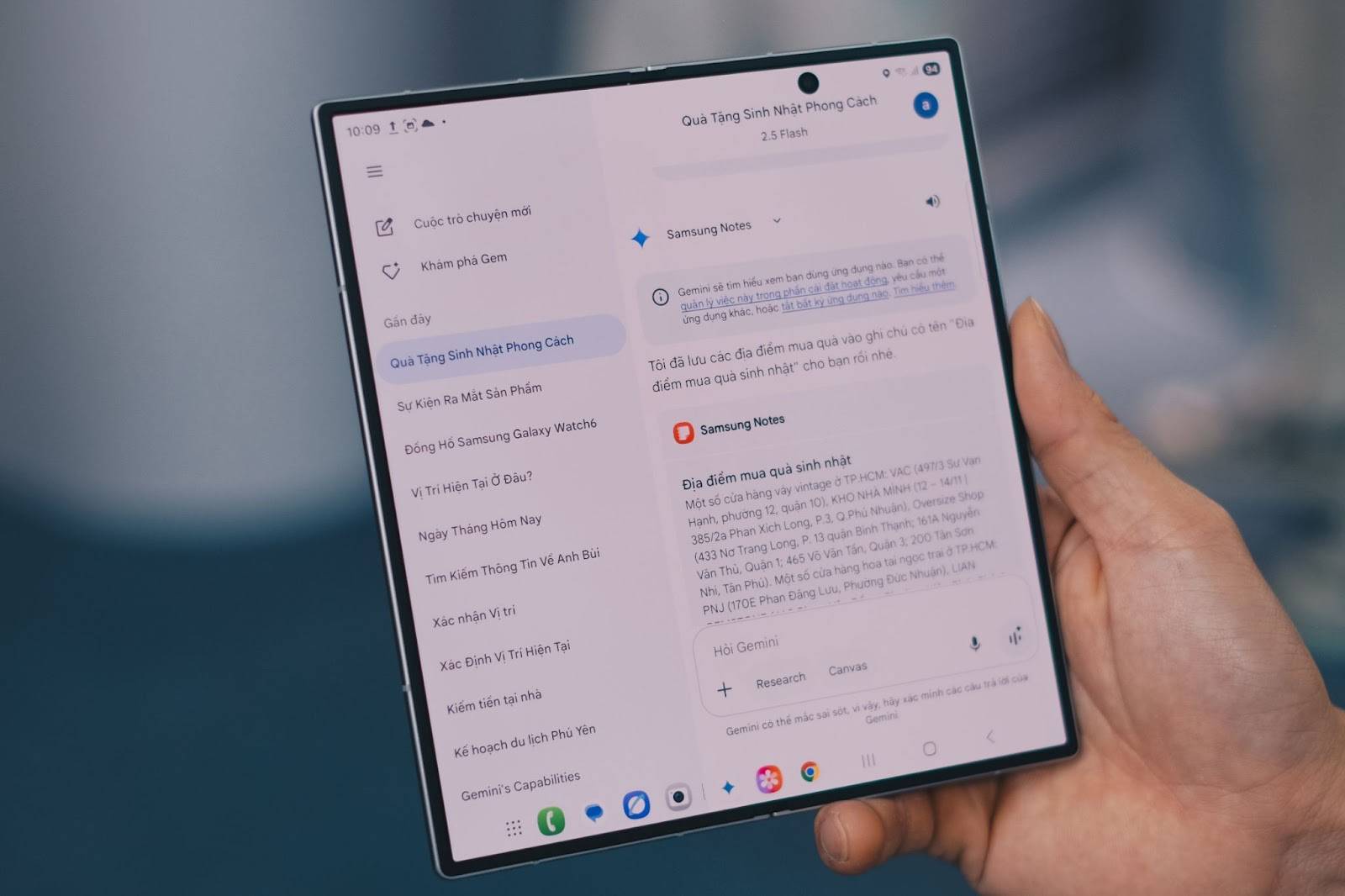 Trợ lý Gemini Live tiếp tục là điểm sáng, cho phép trò chuyện bằng giọng nói trực tiếp trên màn hình lớn. Bạn có thể hỏi về địa điểm, gợi ý nhà hàng, lịch trình chuyến đi hay nhờ AI tổng hợp email – tất cả đều diễn ra mượt mà trong thời gian thực.