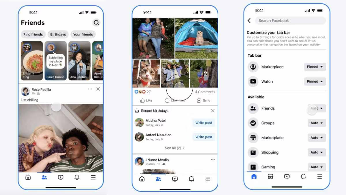 Meta đã công bố trên blog rằng họ đang giới thiệu tab Friends mới trên Facebook. Tab mới này sẽ thay thế tab Friends hiện tại, vốn chỉ chứa yêu cầu kết bạn, gợi ý và danh sách bạn bè của người dùng. Tab Friends mới không chỉ cung cấp cho người dùng các nội dung hiện có như yêu cầu kết bạn và gợi ý, mà còn có một nguồn cấp dữ liệu riêng biệt hiển thị các nội dung như video Reels, ảnh, stories, bài đăng và ngày sinh nhật từ bạn bè của họ.